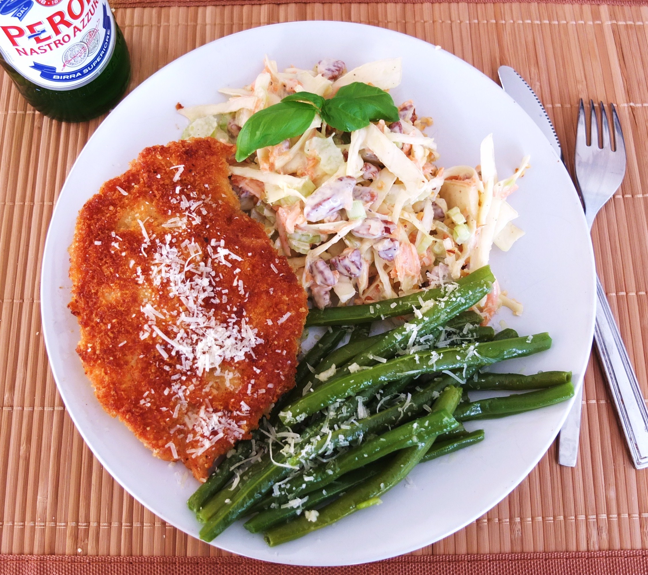 Delicious slaw and beans served alongside Ina Garten’s Parmesan Chicken