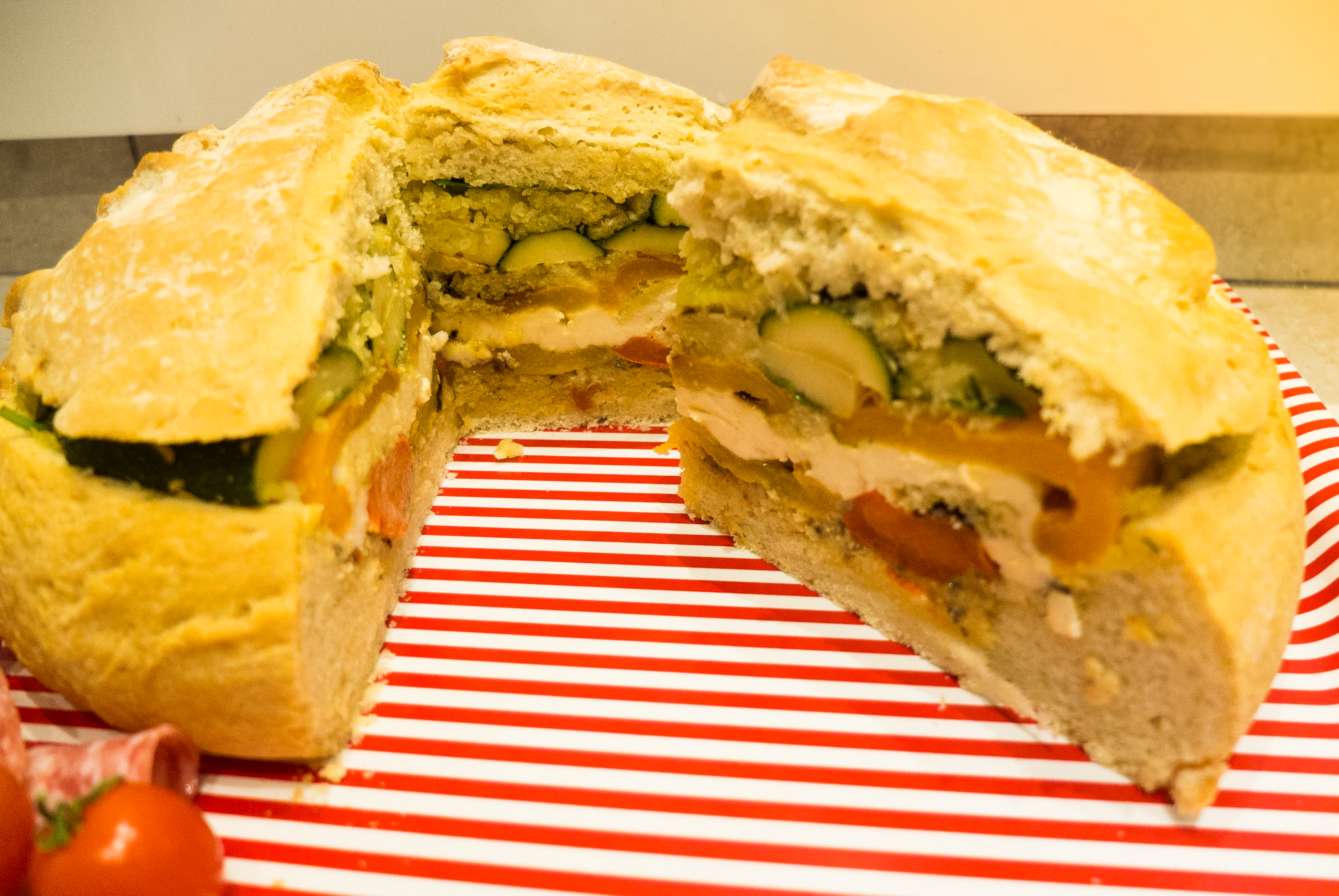 - Take the hollowed out loaf and spread the pesto over the base. Layer first with half the courgettes, then half the peppers, then mozzaralla, then parma ham, then the remaining peppers and courgette. Add basil between the layers
