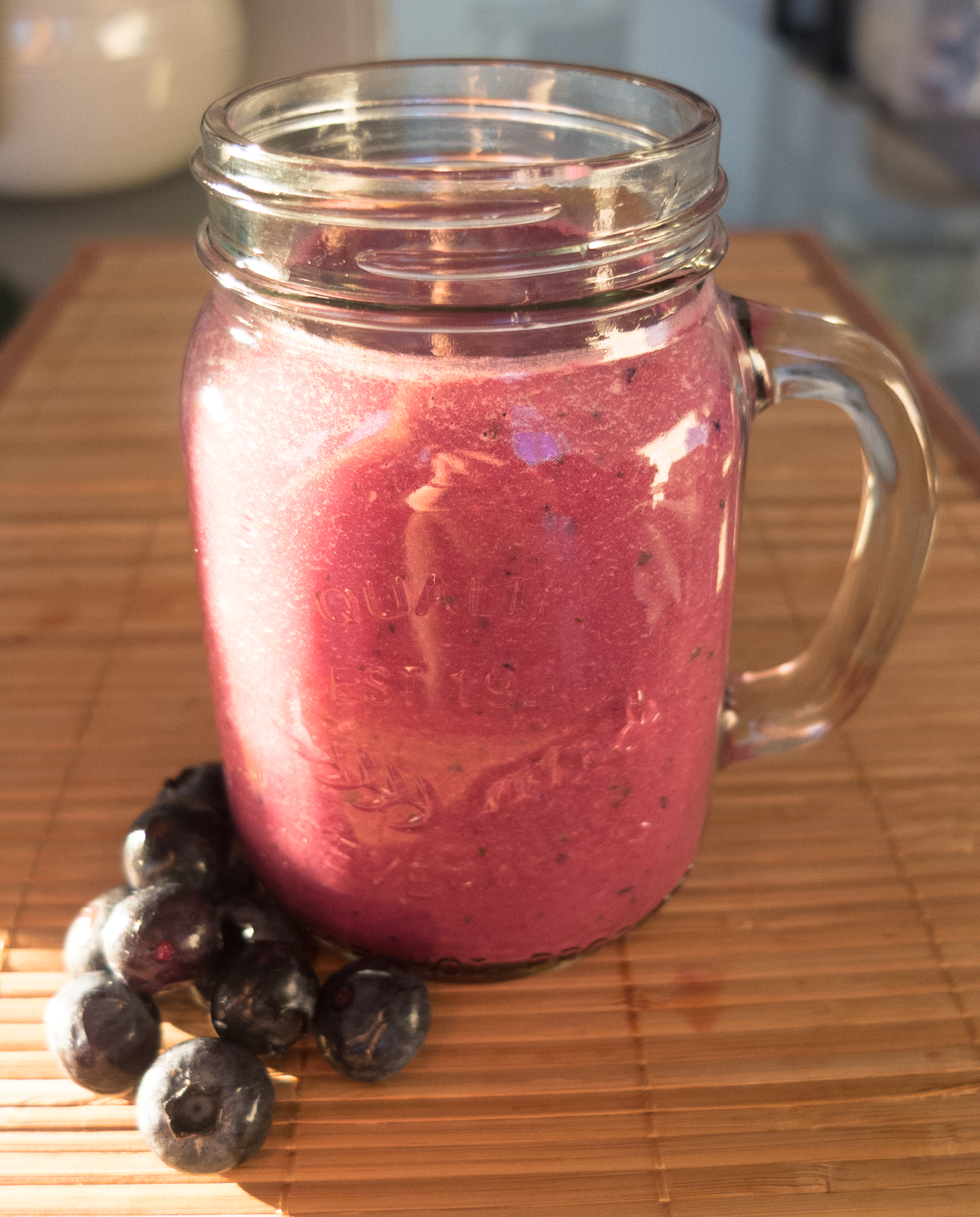 After picking 2 punnets worth of berries (plenty for a freezer stash) I was pretty thirsty… a perfect excuse for a nutritious and delicious blueberry smoothie! The great thing about blueberries is they are not only packed with antioxidants and classed a ‘superfood’ but they are one of the lowest fructose fruits available. I use them every morning in my porridge and stir them through greek yoghurt most evenings.