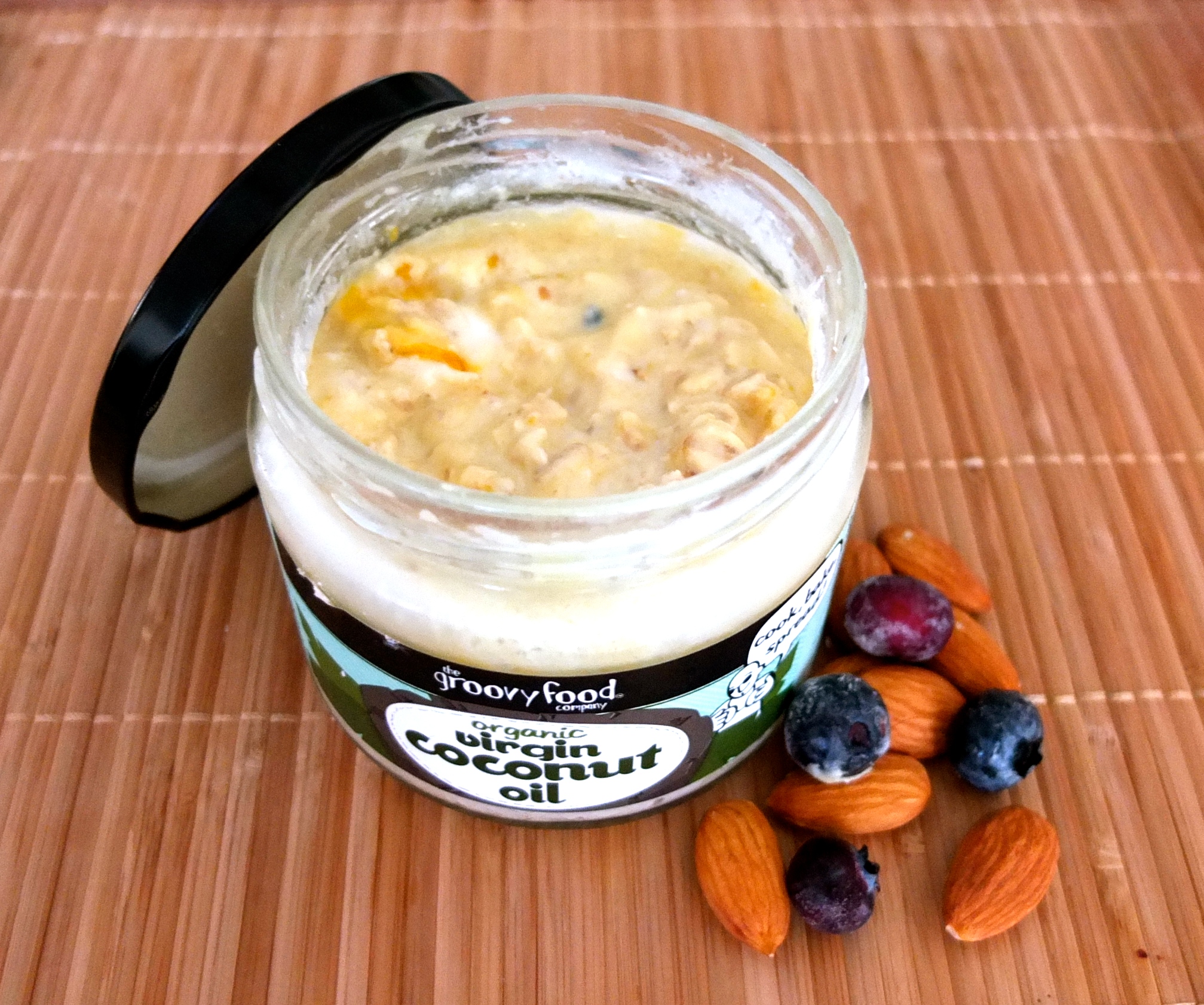 1. Mix together all the ingredients (minus the almonds) in the ’empty’ jar of coconut oil